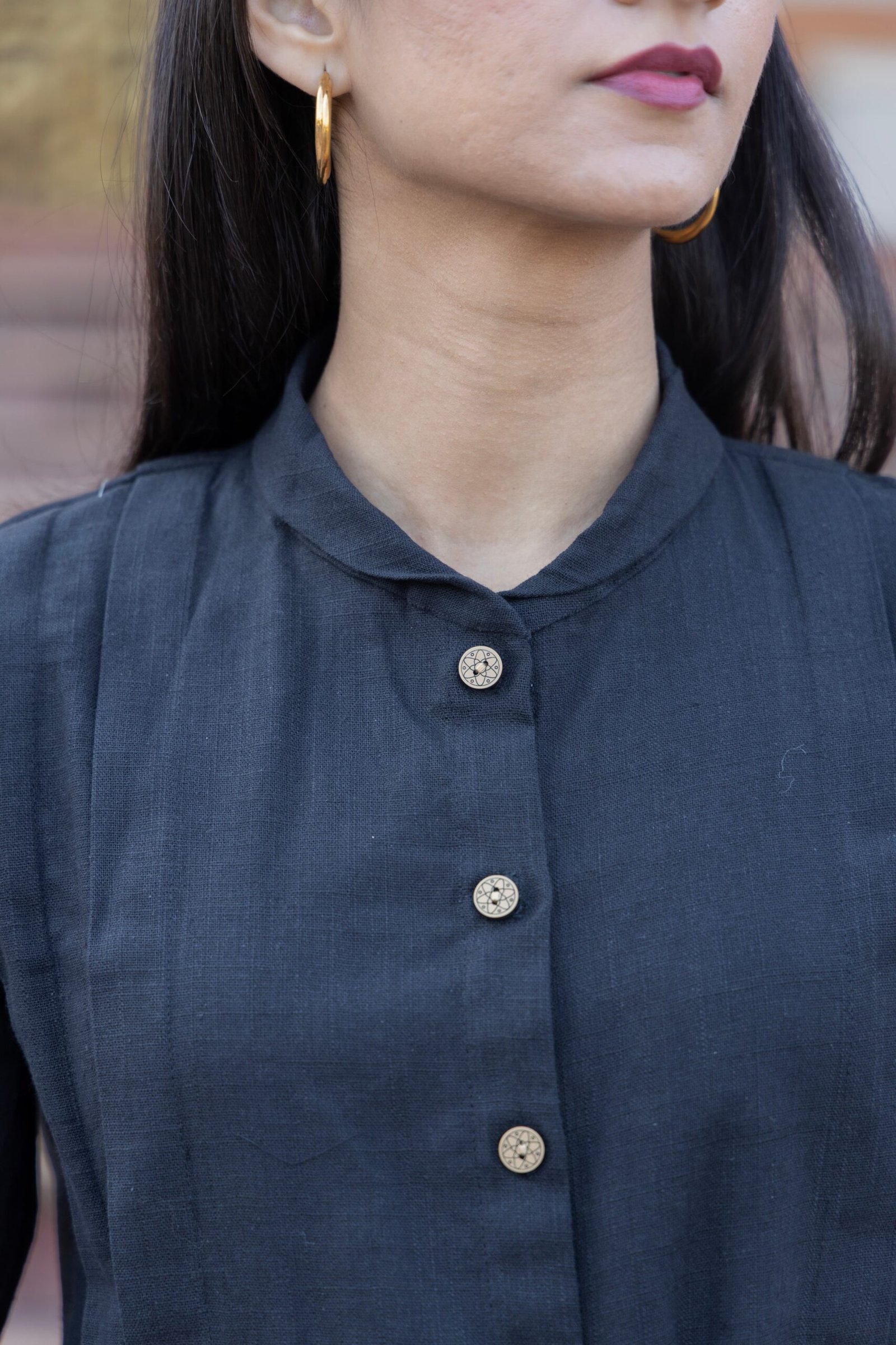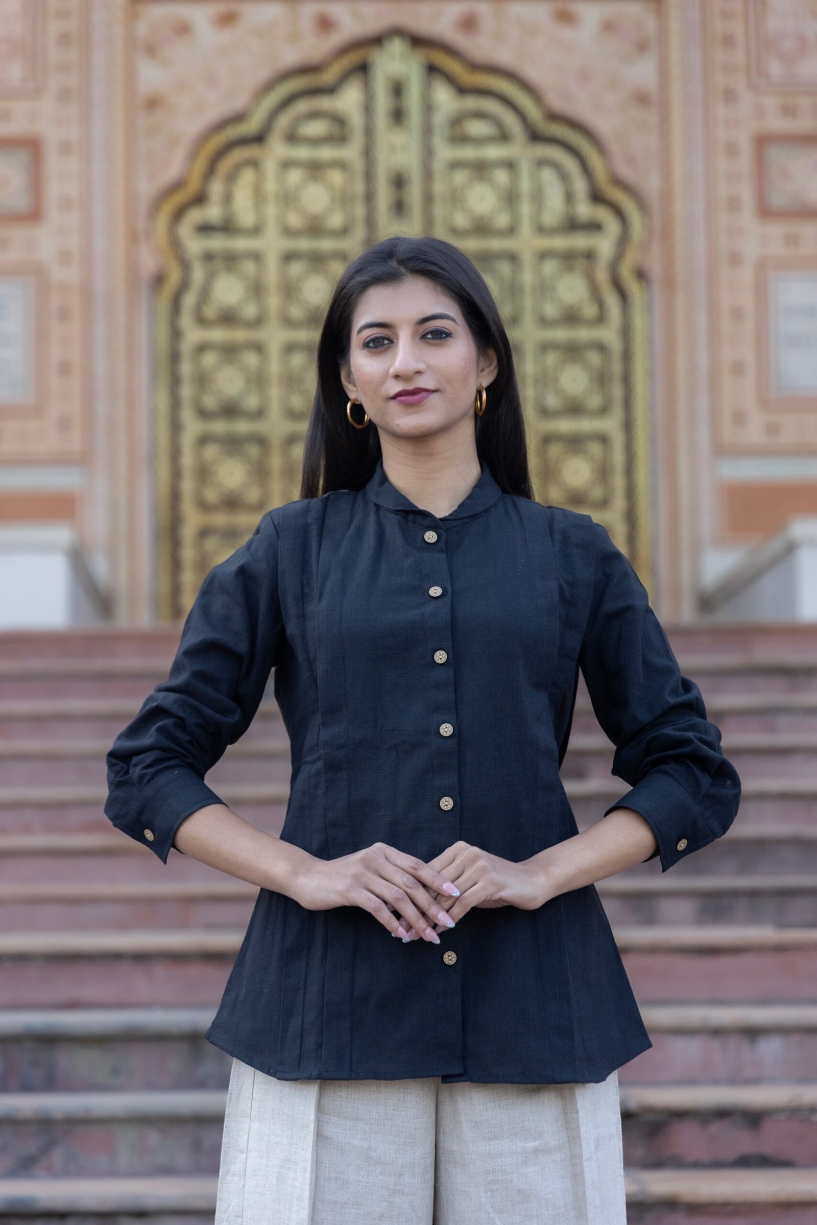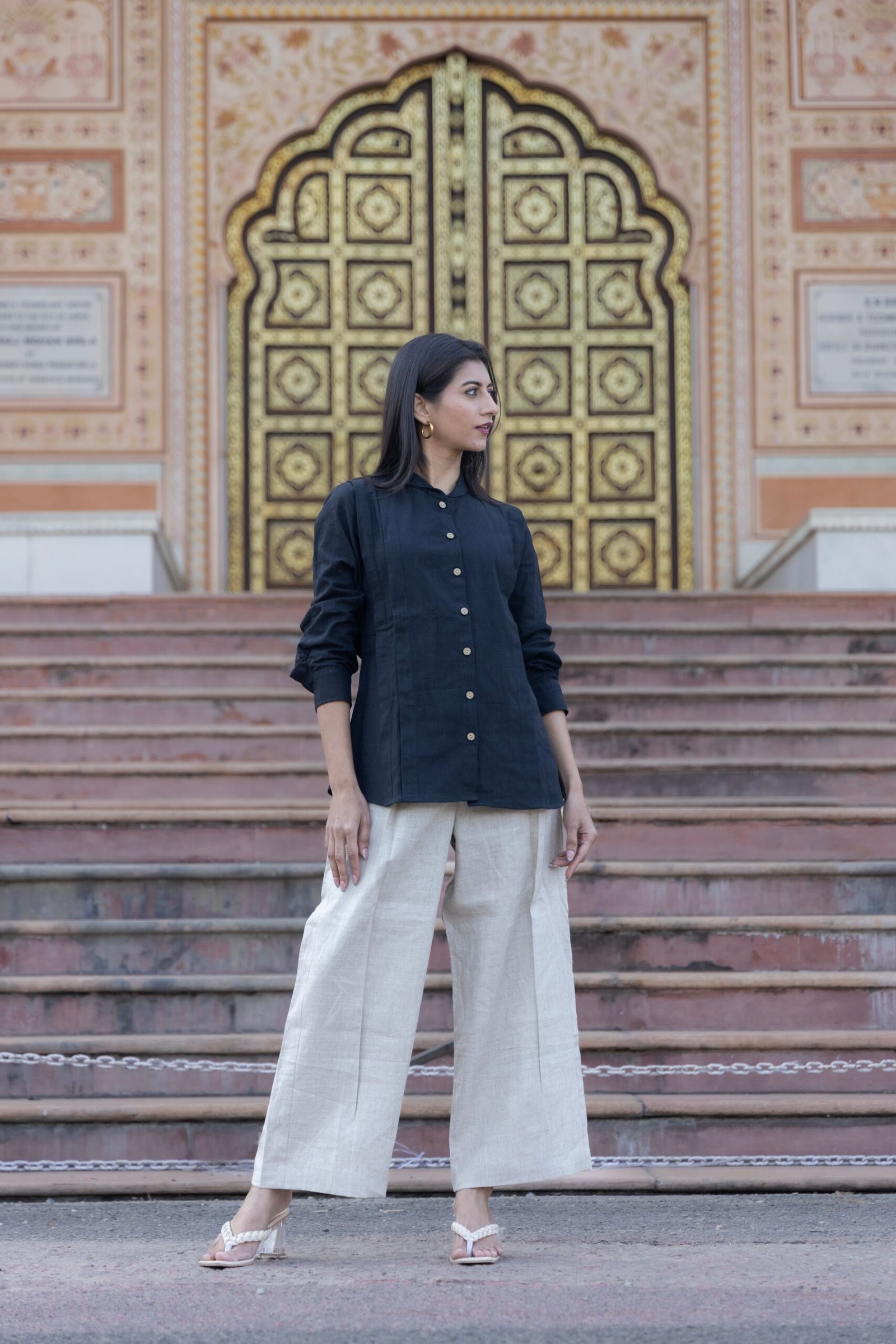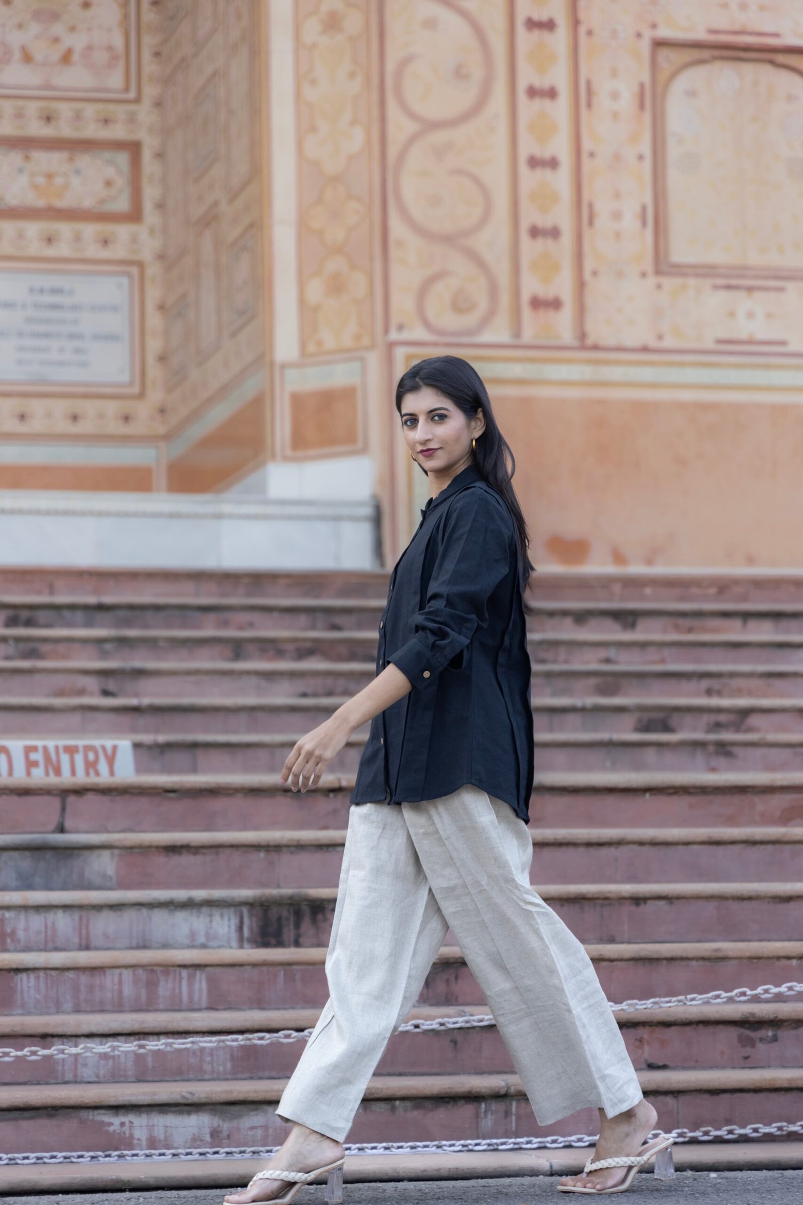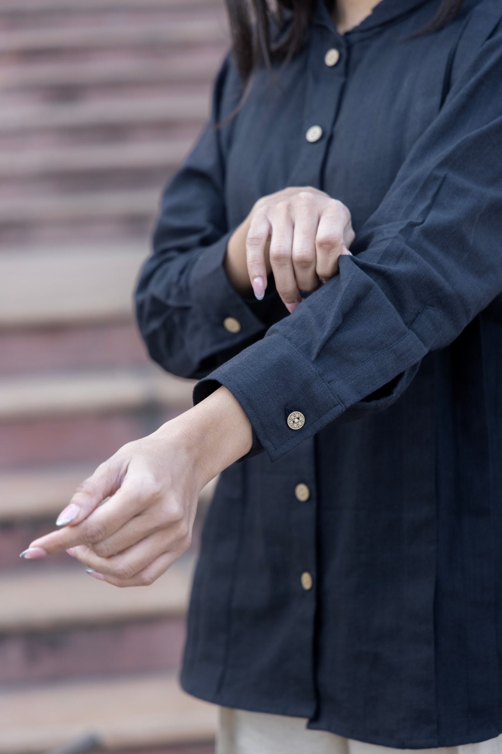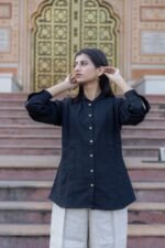Made from a hemp–cotton blend, this black shirt offers breathable comfort with a soft, natural texture. Designed in a relaxed silhouette, it balances everyday ease with understated elegance—perfect for effortless, conscious dressing.