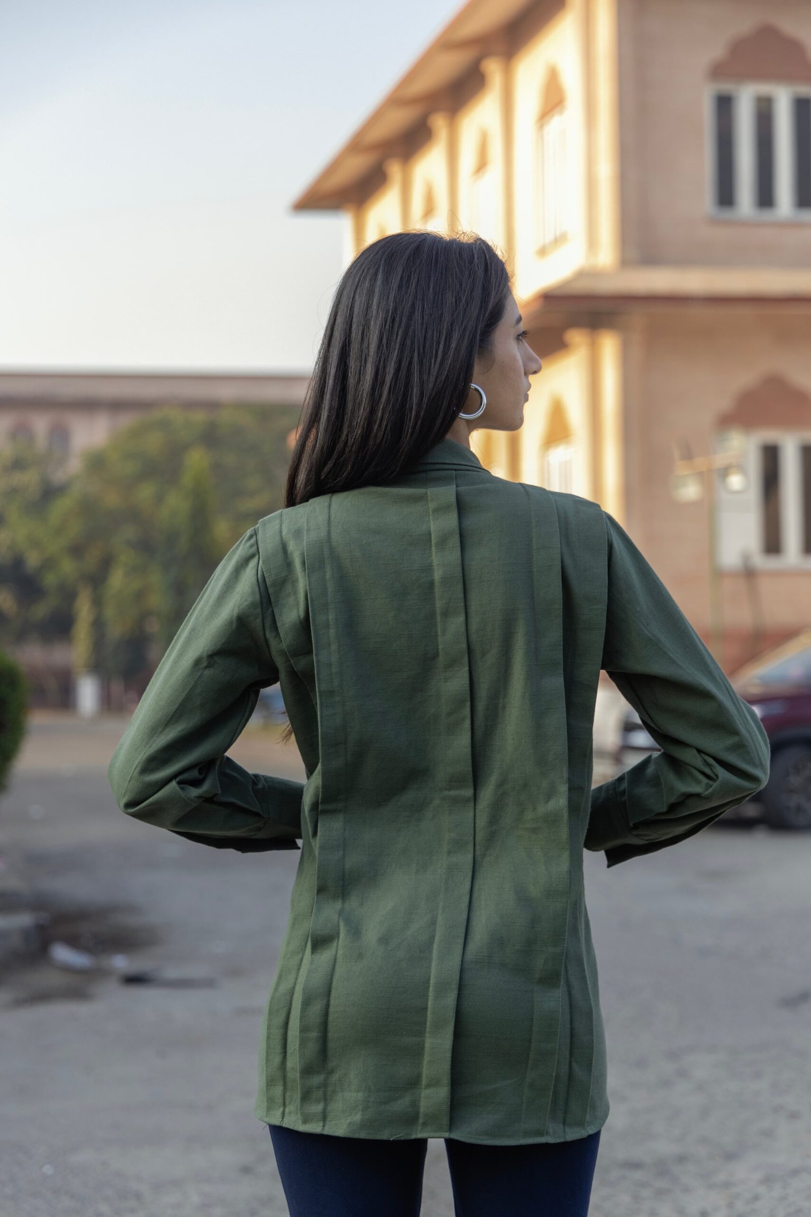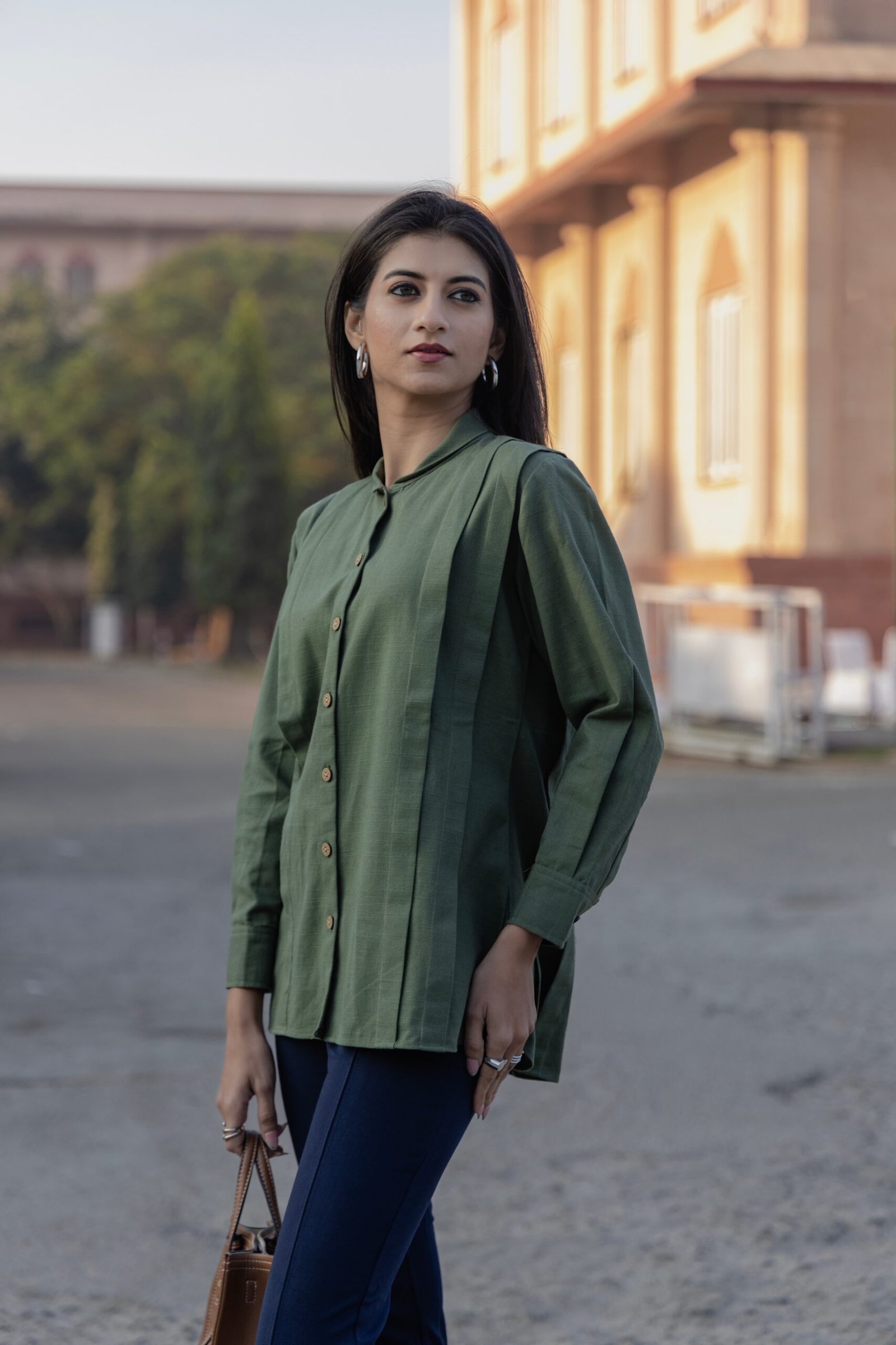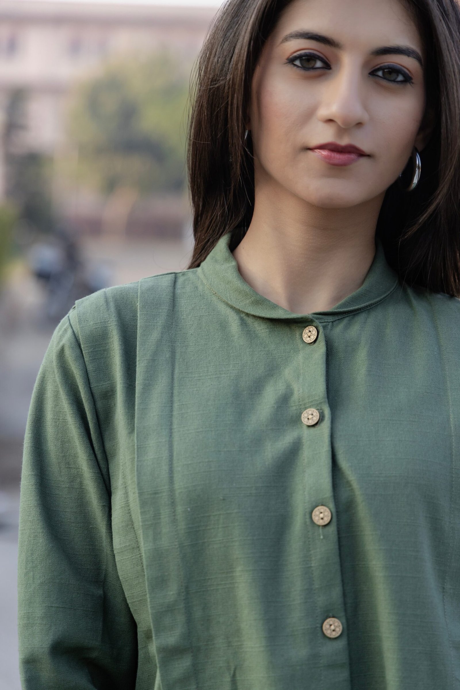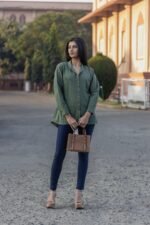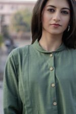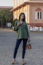 Made from a hemp–cotton blend, this green shirt offers breathable comfort with a soft, natural texture. Designed in a relaxed silhouette, it balances everyday ease with understated elegance—perfect for effortless, conscious dressing.