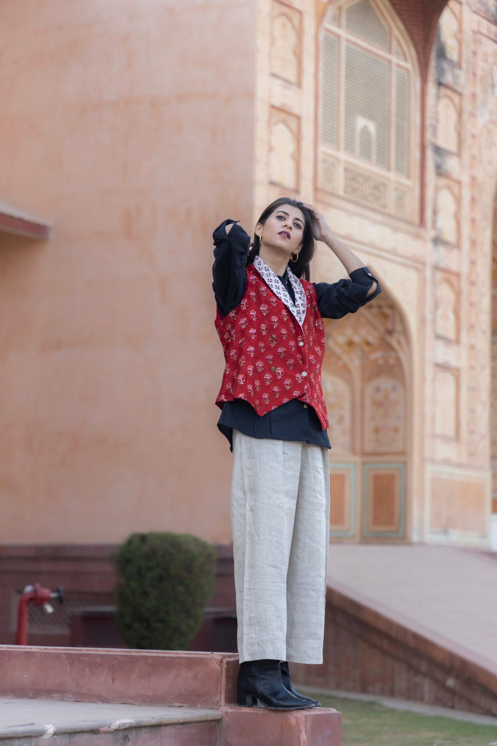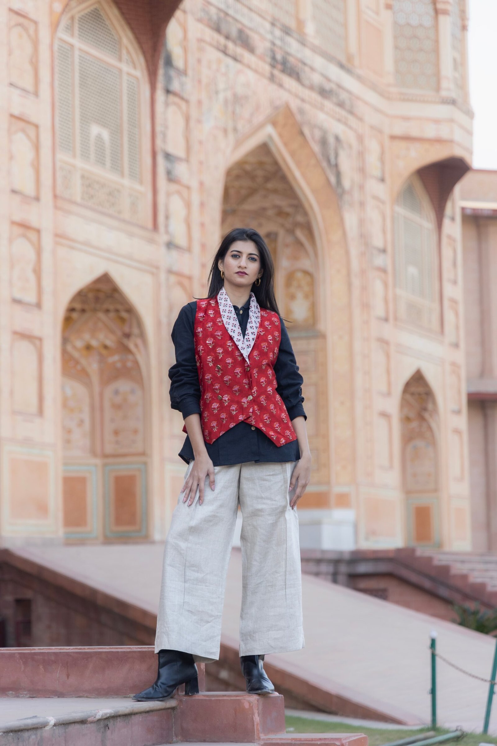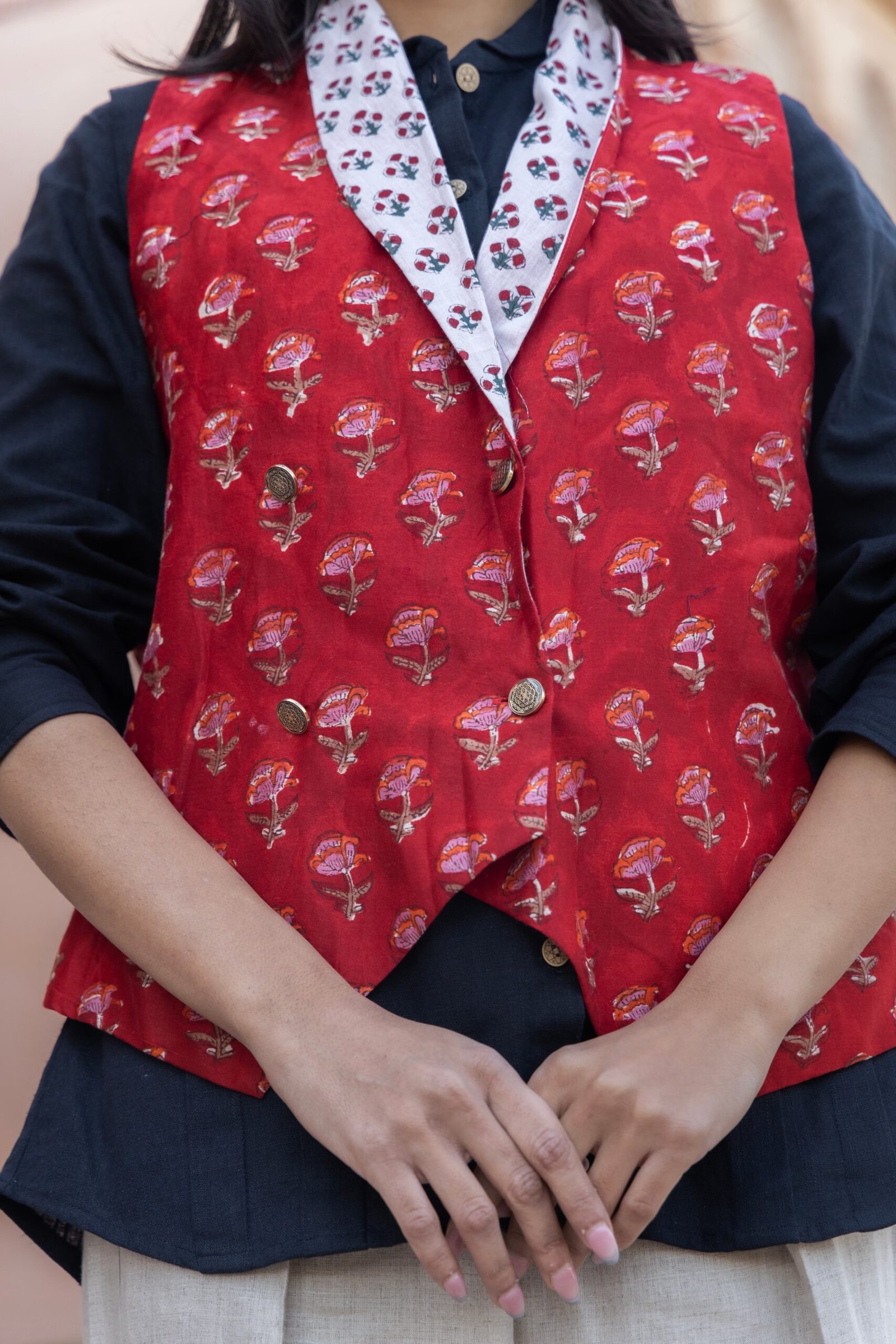 Chanderi Cotton Half Jacket paired with Hemp Cotton Shirt